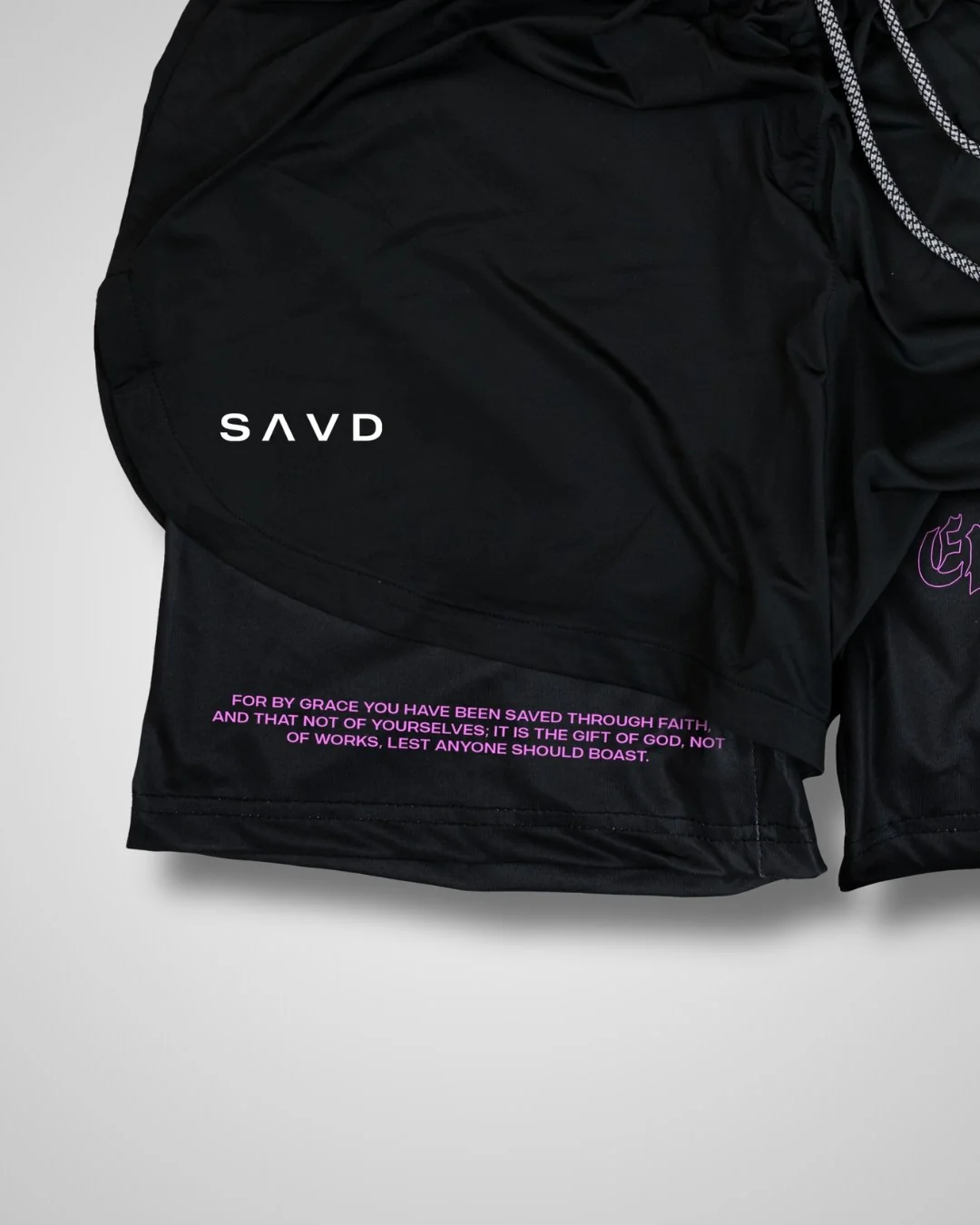 Stay active and full of faith with these limited-edition Christian performance shorts, designed to keep you moving with confidence and courage. Featuring the Ephesians 2:8 Bible verse:
